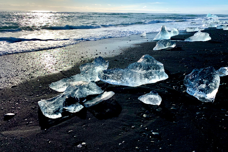 Am Ende der Gletscherlagune befindet sich ein weiterer magischer Ort. Nach und nach schwimmen die Eisberge einen kleinen Fluss entlang und werden schlussendlich an einem schwarzen Sandstrand an Land getrieben. Vor allem wenn die Sonne scheint, weißt du, warum dieser Strand auch gerne Diamond Beach genannt wird. Im Kontrast zum tiefschwarzen Sand funkeln die Eisbrocken hier wie Diamanten.